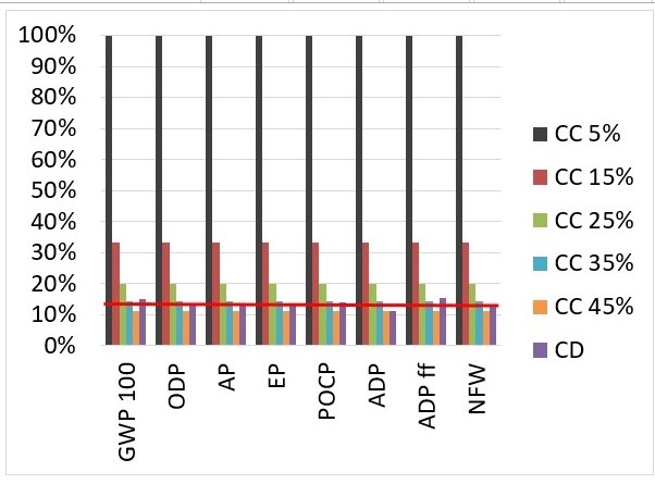 BUENO, C. et al. Sensitivity analysis of the use of Life Cycle Impact Assessment methods: a case study on building materials. Journal of Cleaner Production, Elsevier, v. 112, p. 2208 – 2220, 2016.