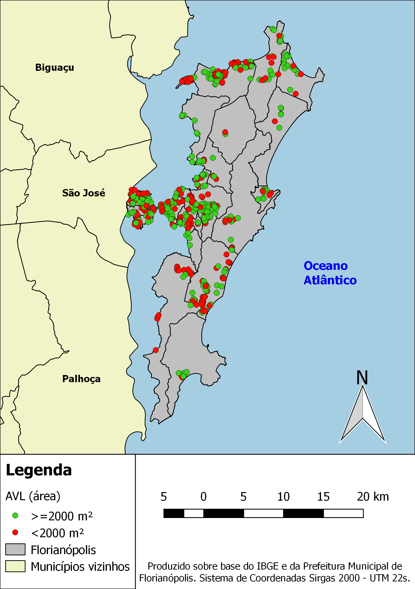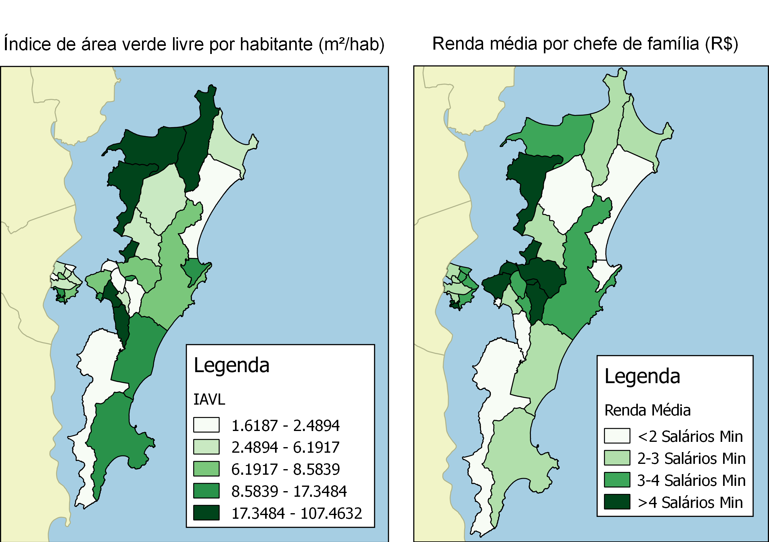 Áreas verdes e espaços livres no meio urbano desempenham funções sociais, estéticas, ecológicas, educativas e estão diretamente relacionadas à qualificação de uma cidade. O poder público deve instalar, administrar e garantir a manutenção e acessibilidade dessas áreas, de modo que, todos os habitantes tenham diretos iguais em usufruir desses espaços. Sendo assim, este estudo discute como a distribuição populacional e de renda em Florianópolis (SC), relaciona-se com a disposição de áreas públicas de lazer. Optou-se como método de investigação uma análise exploratória e quantitativa, por meio de Sistemas de Informação Geográfica, das Áreas Verdes Livres (AVL) delimitadas pelo Zoneamento municipal. Como principal resultado, evidenciou-se que há uma distribuição desequilibrada de AVL e há uma correlação dessa distribuição com a concentração de renda no município. Secundariamente, este estudo motiva uma revisão da legislação municipal vigente, a adequação das bases cartográficas fornecidas pelo poder público e a disponibilização de notas metodológicas para a sua definição.