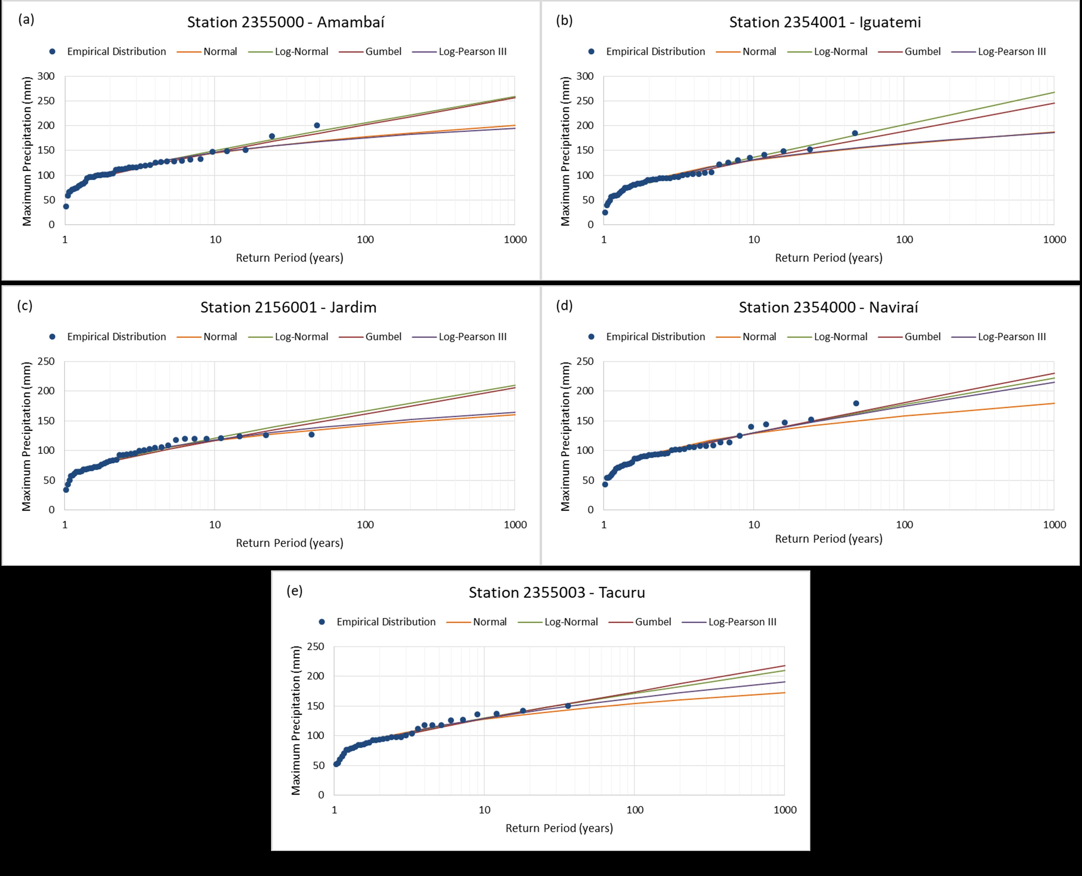 É necessário conhecer as ocorrências extremas de precipitação em uma região para obtenção de projetos de infraestrutura satisfatórios. As regiões de clima tropical são caracterizadas por seus eventos de chuvas intensas durante o verão e, nos últimos anos, em decorrência das mudanças climáticas, esses eventos estão se tornando recorrentes. Um modelo de distribuição de probabilidade teórica é normalmente aplicado para extrapolar eventos extremos para altos períodos de retorno. Neste estudo, verificou-se se os modelos de distribuição de probabilidade são eficientes para estimar eventos extremos de precipitação para o período de retorno recomendado em normativas de dimensionamento de obras hidráulicas. Cinco cidades do estado de Mato Grosso do Sul, localizadas na região centro-oeste do Brasil, que foram afetadas por desastres causados por fortes chuvas foram adotadas como estudo de caso. Os resultados ilustram que as recomendações dos períodos de retorno utilizados para o dimensionamento das estruturas de controle hidráulico são insuficientes para evitar os danos causados por eventos de precipitação, gerando um alto risco de ruptura das estruturas.Referências