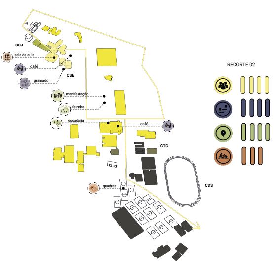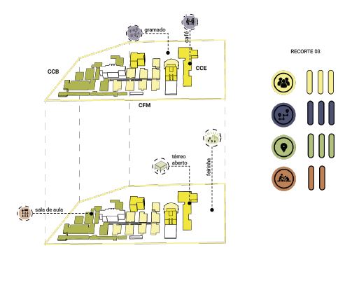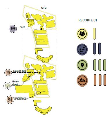 As edificações do espaço não contribuíram para o fortalecimento das interações, promovido pela estrutura acadêmica em centros e departamentos de ensino, a qual limitou a sua função de ensino, pesquisa e extensão a um formato institucional. Esse formato vinculado a um ensino tradicional, no interior de edificações, dificulta a comunicação e a conexão entre centros, descentralizando a troca de informações. Porém, esse sistema tem funcionado pela falta de atividades interdisciplinares entre os centros de ensino.