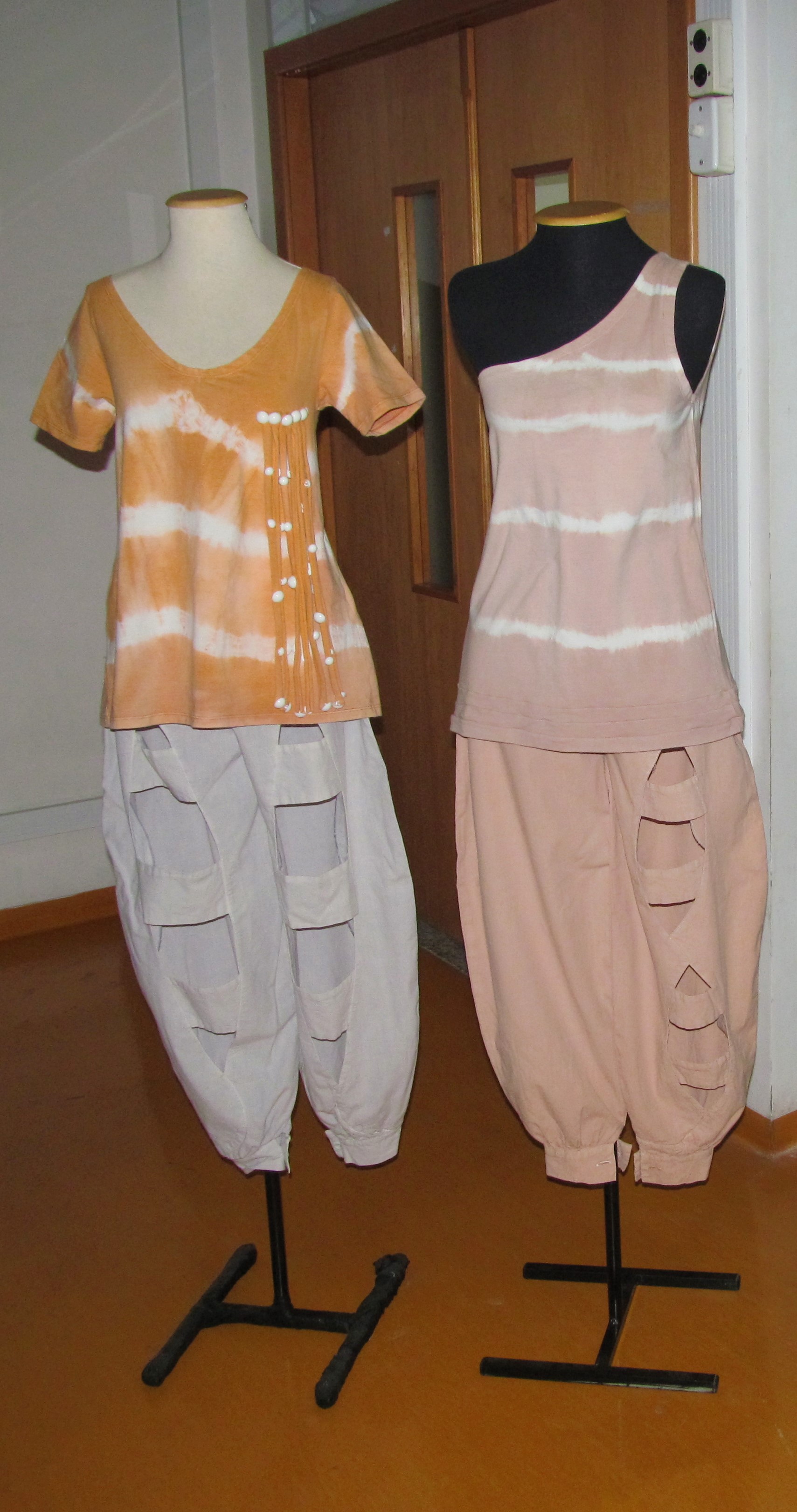 Como principais resultados deste trabalho obtiveram-se corantes que, na interação com as fibras, provocaram tingimentos uniformes, os materiais corantes foram utilizados em pouca quantidade, composição química inserida nos padrões sustentáveis, poucos resíduos expelidos nas sobras dos banhos de tingimento, uma cartela de cores variadas, boa solidez às lavagens e à luz, o planejamento de uma coleção de roupas e quatro peças das mesmas confeccionadas (Figura 1), com a aplicação dos corantes naturais, o que conferiu aos extratos corantes a qualidade de sustentáveis.