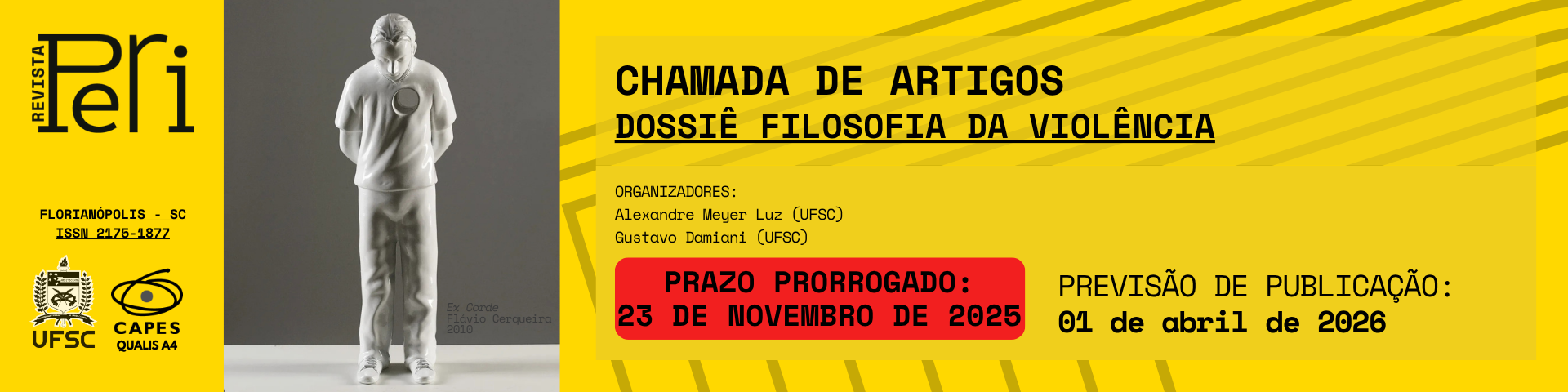 A Revista PERI (Qualis A4), vinculada ao Programa de Pós-Graduação em Filosofia da Universidade Federal de Santa Catarina, está com chamada aberta para o Dossiê: Filosofia da Violência, cuja previsão de publicação é abril de 2026. Assim, é com satisfação que o Corpo Editorial da PERI, em conjunto com o editor convidado Alexandre Meyer Luz (UFSC), convidam pesquisadoras(es) a submeterem artigos até 23 de novembro de 2025.